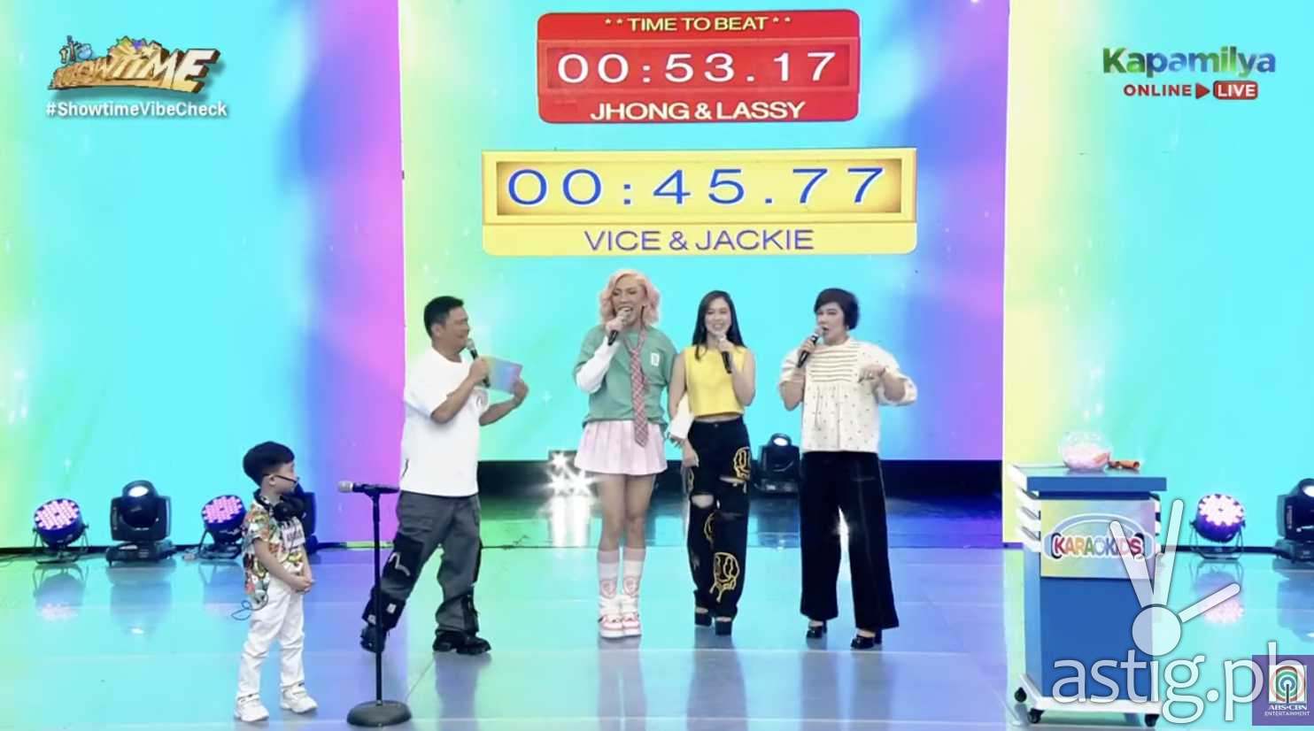 The segment unfolds with four pairs of “It’s Showtime” hosts competing to guess two songs within a two-minute timeframe from their selected ‘karaokid.’ The fastest pair secures a win of P10,000 and advances to the jackpot round.