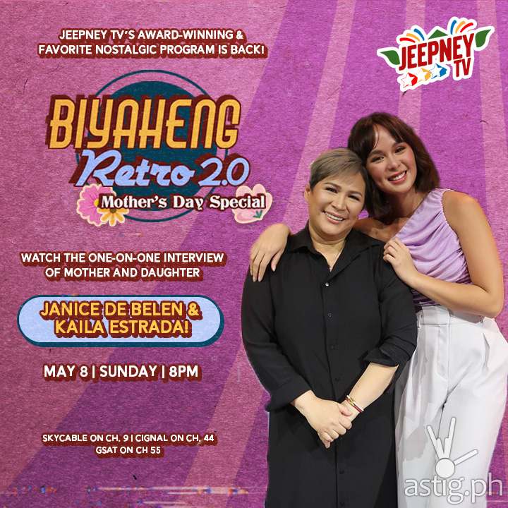 MANILA, Philippines – Seasoned actress Janice de Belen and “Viral Scandal” star Kaila Estrada will talk about their special mother-daughter relationship in Jeepney TV’s “Biyaheng Retro 2.0.” The Mother’s Day Special will have the two in a fun dialogue featuring questions they have previously never asked each other with surprising and inspiring revelations. Catch “Biyaheng Retro 2.0” on your favorite throwback channel, Jeepney TV, this Sunday (May 8) at 8 pm and the uncut version on Jeepney TV Facebook page and YouTube channel on Tuesday (May 10).