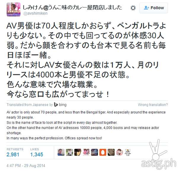 “In this industry, there are only 70 male porn stars to 10,000 women. The number of male porn stars in Japan is less than that of Bengal tigers,” he wrote. “With 4,000 new films every month, the number of male actors simply isn’t enough. This industry is like a hole in the wall that needs to get bigger!”
