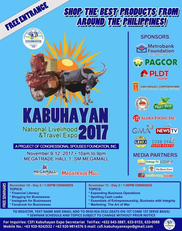 Congressional Spouses Foundation, Inc. invites you to join the Kabuhayan National Livelihood and Travel Expo 2017 from November 9 to 12 at Megatrade Hall 1 of SM Megamall.