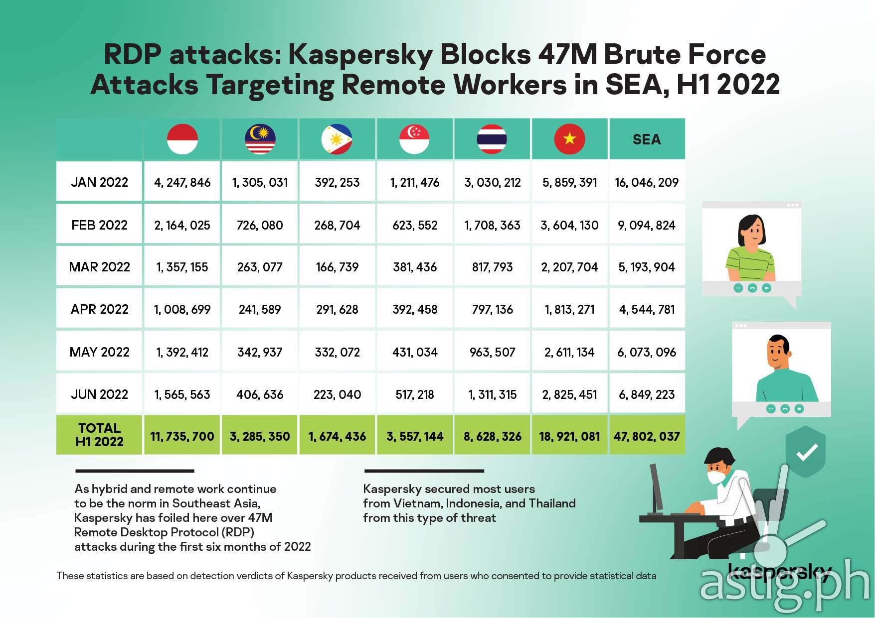 The number of Bruteforce.Generic.RDP targeting remote workers in the region logged a total of 47,802,037 incidents from January to June this year. On average, Kaspersky solutions blocked 265,567 brute-force attacks in SEA daily.