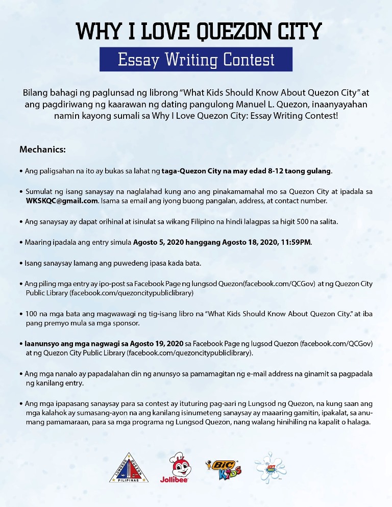 Bilang bahagi ng paglunsad ng librong “What Kids Should Know About Quezon City” at ang pagdiriwang ng kaarawan ng dating pangulong Manuel L. Quezon, inaanyayahan ng QC government ang mga batang residente na sumali sa “Why I Love Quezon City: Essay Writing Contest.”