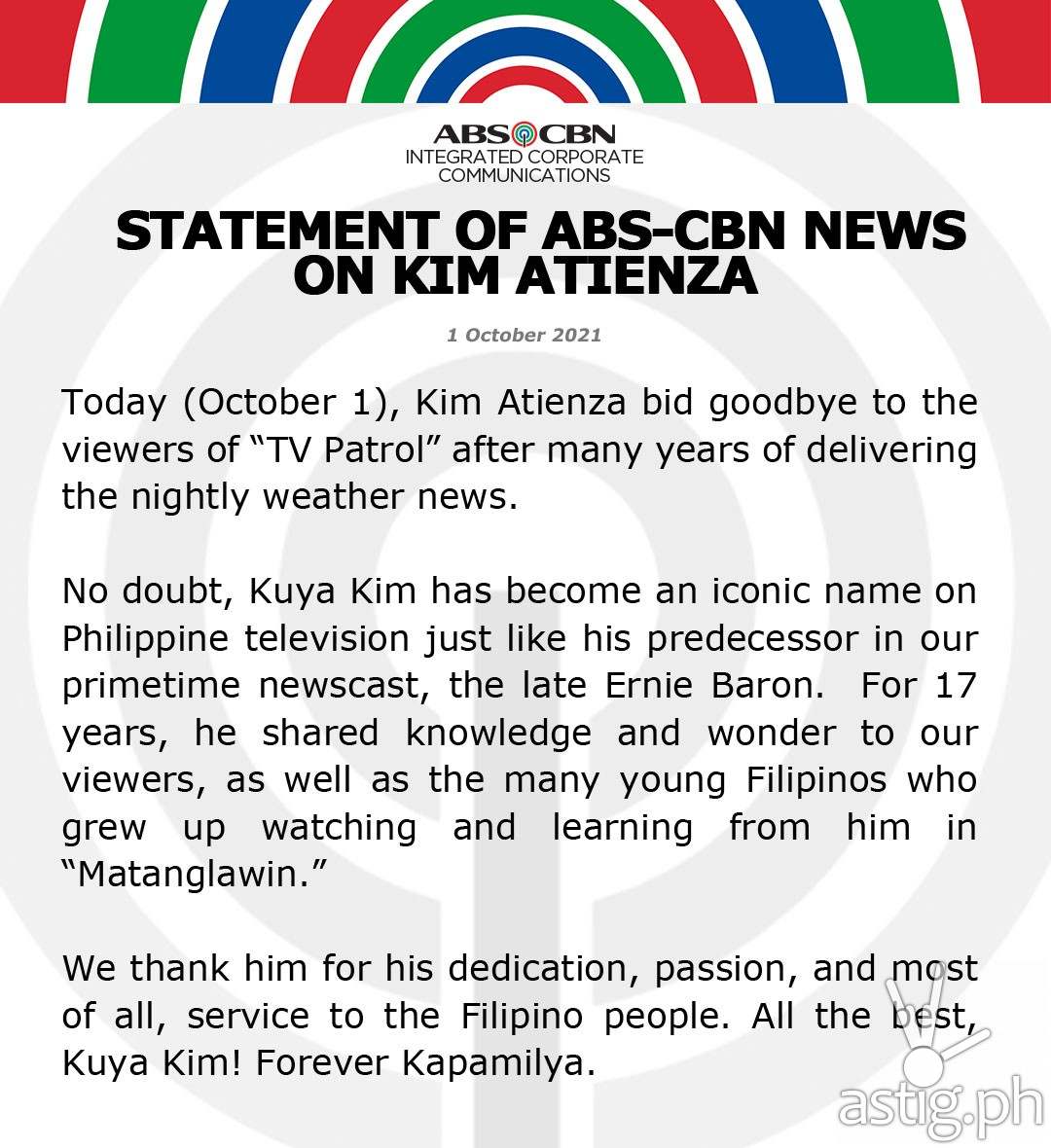 ABS-CBN has issued the following statement following the announcement that Kim Atienza is switching over to GMA Network: