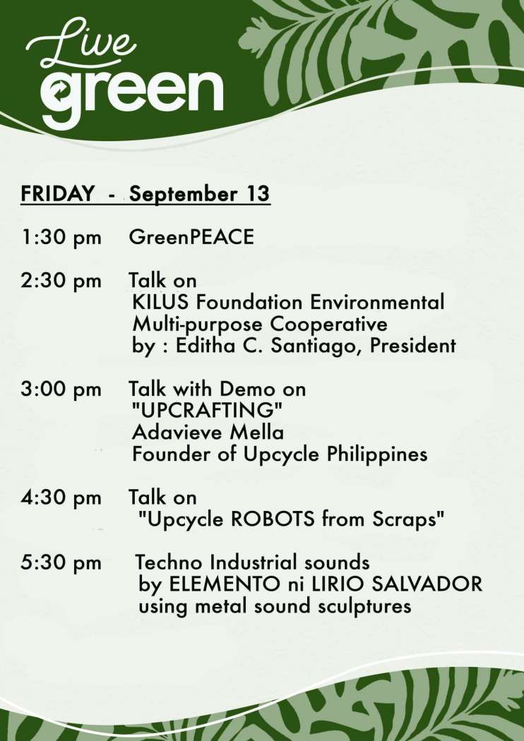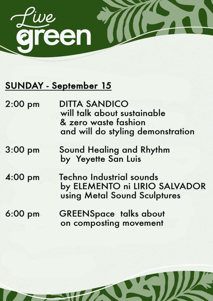 • 3:00PM – Zero-waste advocate Mitchie Jimenez offers people pointers on zero-waste living, sharing her favorite all-natural cleaning solutions and environment-friendly kitchen cleaning products.