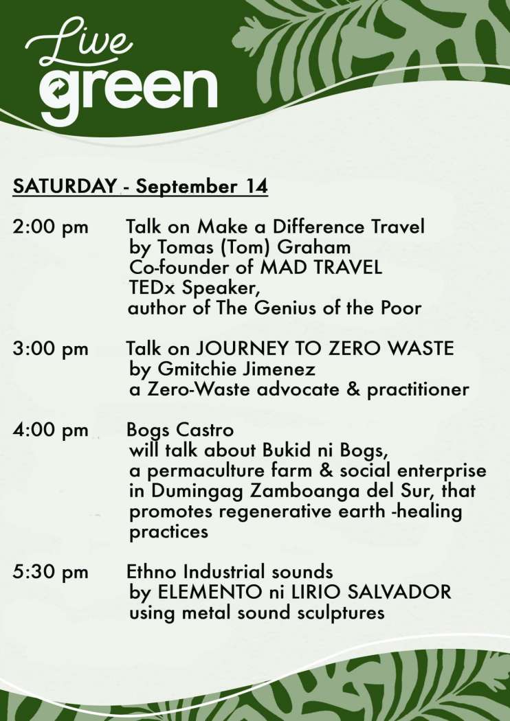 Finally, Live Green wraps up the fair with another impressive roster of speakers on Sunday, September 15 at 2:00-6:00 PM: