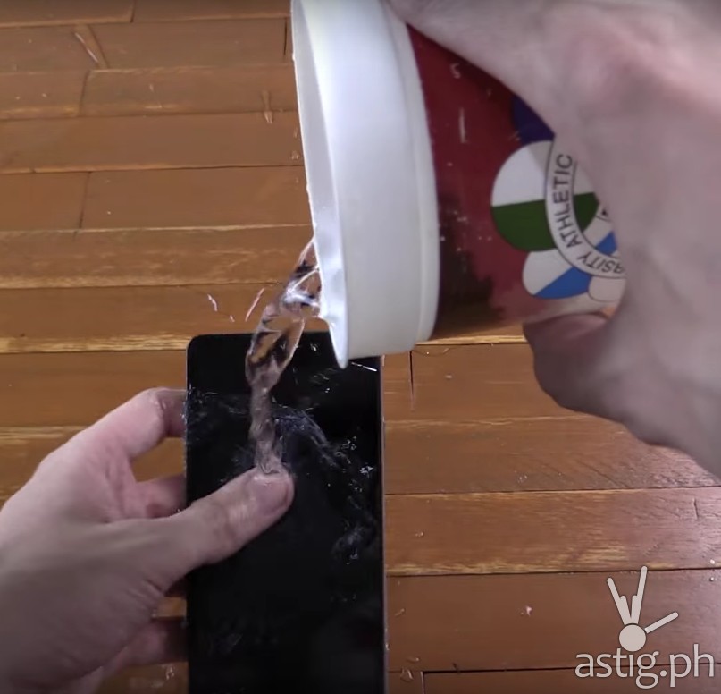 I couldn’t find any specifics about the kind of spills that would be covered by this nano-coating so I went all out and poured a full cup of water over the phone.