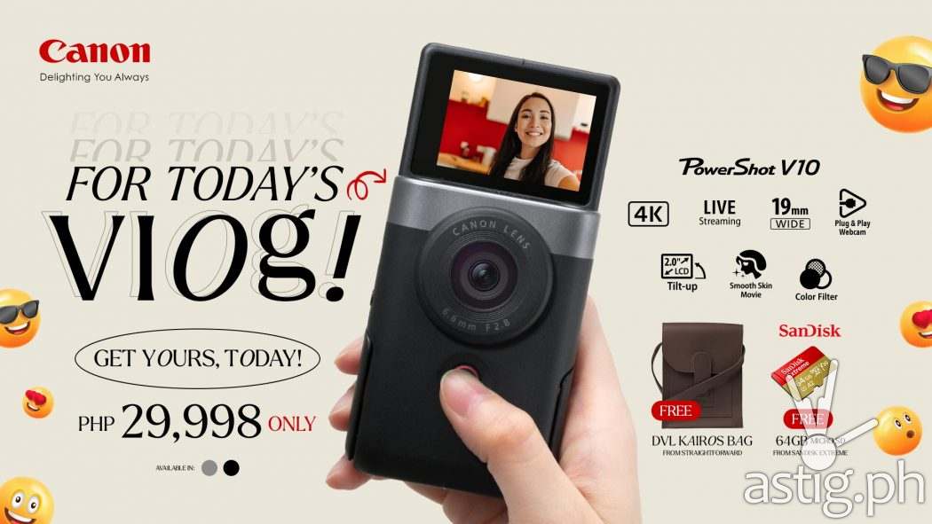Create high-quality content and level-up your social media content with the new Canon PowerShot V10 which is locally priced at Php 29,998 and comes with FREE SanDisk 64GB Extreme® microSD™ card – Extreme speeds for fast transfer, app performance and 4K UHD video and FREE DVL KAIROS BAG from Straightforward – this exclusive package is available until supplies lasts*