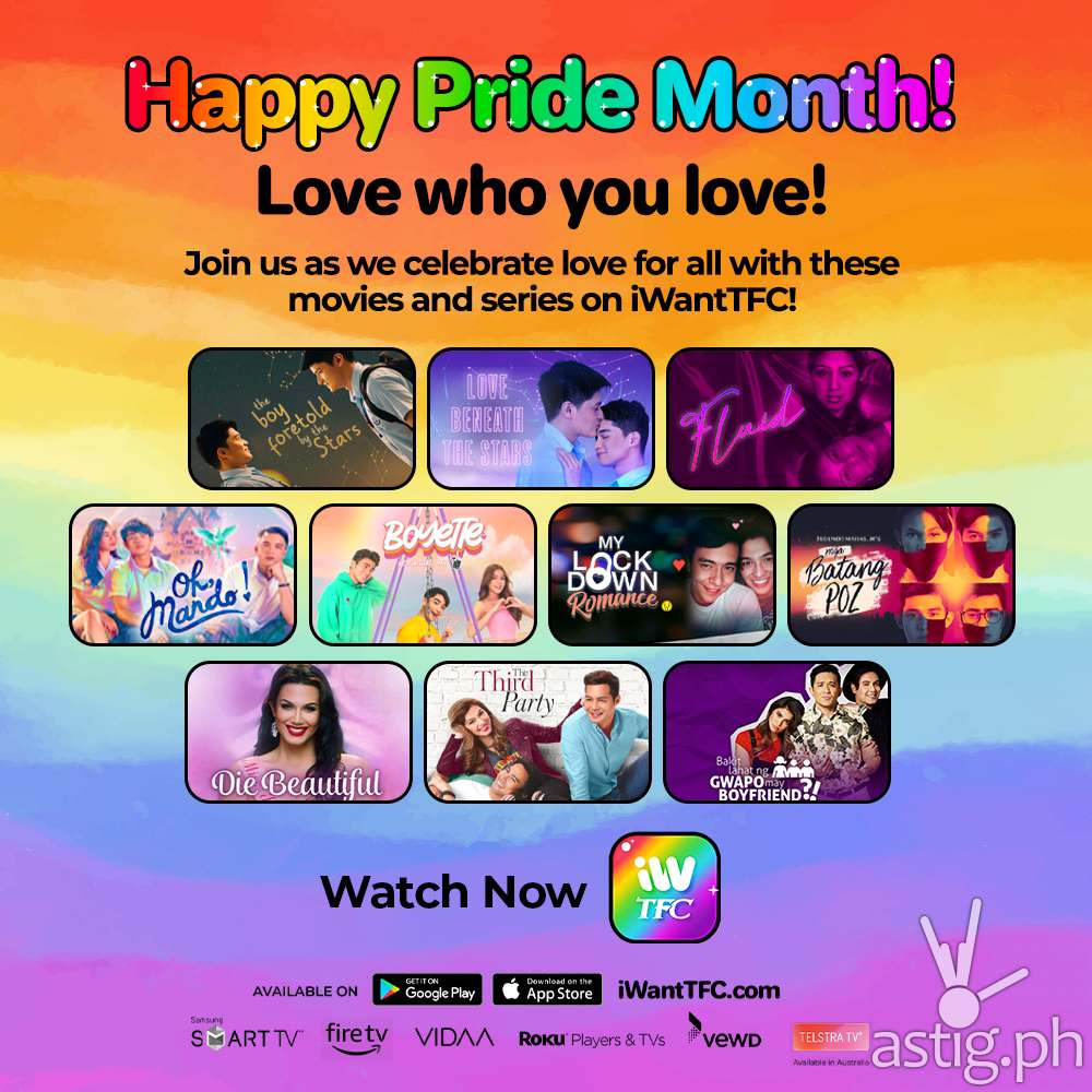 Viewers can also watch “Oh, Mando!,” “Mga Batang POZ,” “Die Beautiful,” “Third Party” and Thai titles “Bad Buddy,” “Enchanté,” “Not Me,” “Baker Boys, and “Dark Blue Kiss.” Celebrate Pride Month by watching these movies and series for free on the iWantTFC app (iOs and Android) and website (iwanttfc.com). Viewers can get easy access to iWantTFC’s content library with its “watch now, register later” feature. Watch iWantTFC on a larger screen with select devices, including VEWD, ROKU, and Amazon Fire streaming devices, Android TV, select Samsung Smart TV models, Telstra TV (in Australia), and VIDAA in select countries. Additionally, iWantTFC is available via Chromecast and Airplay. Visit https://iwanttfc.com/help#tfc-on-smart-tv for a complete list of compatible devices, sign-in instructions, and account activation.