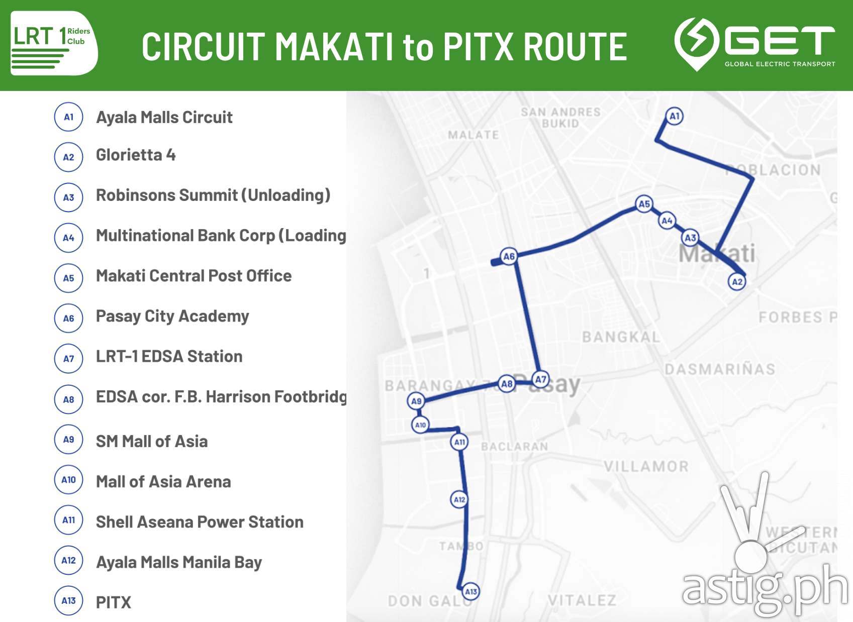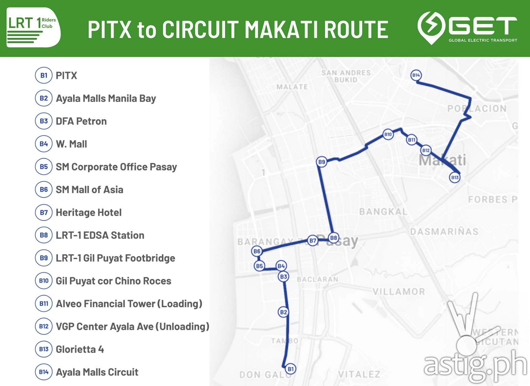 Given the successful pilot implementation, the shuttle service route will now be extended to Circuit Makati (Ayala Malls Circuit) with LRT-1 Gil Puyat Footbridge and select areas going to Makati Central Business District and Ayala Malls Circuit as additional designated loading/unloading points.