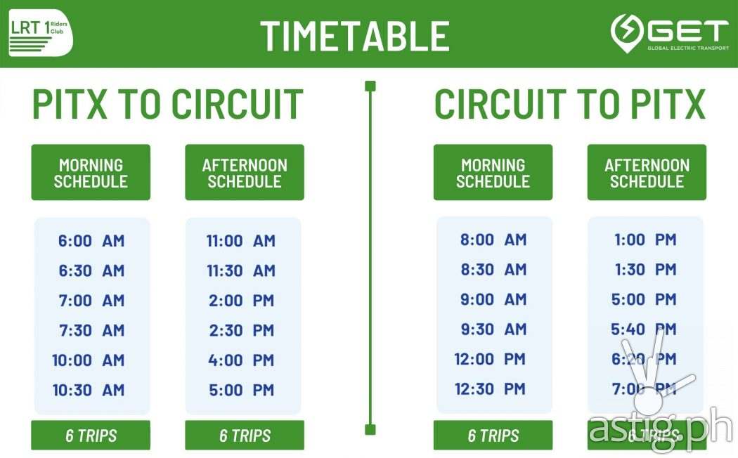 COMET electric buses operate from Monday to Saturday, excluding holidays, with the first trips leaving PITX at 6:00am and Circuit Makati at 8:00am. Last trips are scheduled at 5:00pm (PITX) and 7:00pm (Circuit Makati).