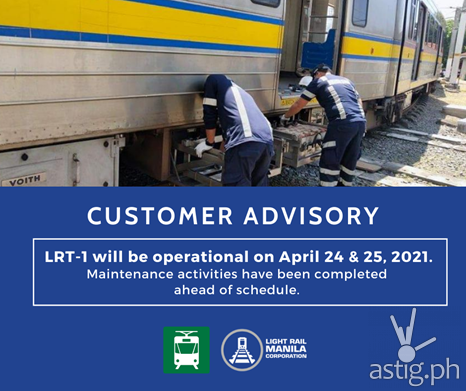 PHILIPPINES – Private operator of LRT-1 Light Rail Manila Corporation (LRMC) announces that LRT-1 operations will no longer be suspended on 24 – 25 April 2021 as majority of the planned maintenance works have already been completed ahead of schedule.