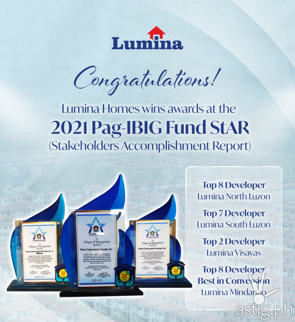 Among Lumina’s awards was the Highest Conversion Performance among Pag-IBIG Fund’s top partner housing developers in Mindanao in 2021.