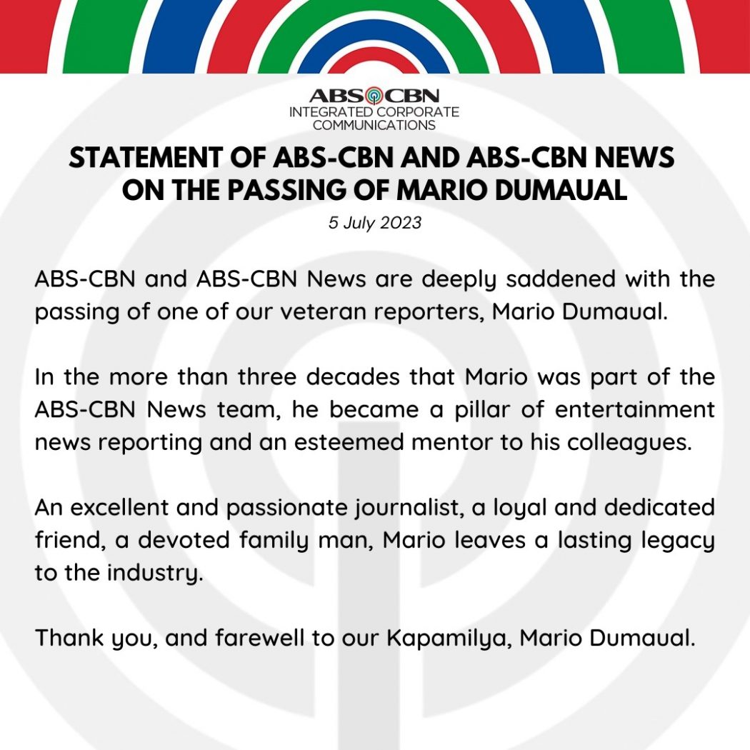 STATEMENT OF ABS-CBN AND ABS-CBN NEWS ON THE PASSING OF MARIO DUMAUAL