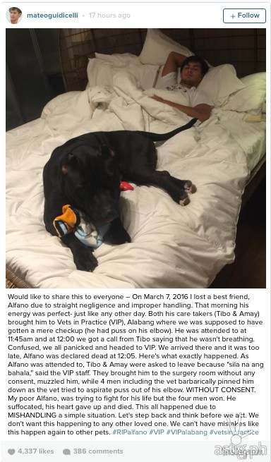 Would like to share this to everyone — On March 7, 2016 I lost a best friend, Alfano due to straight negligence and improper handling. That morning his energy was perfect- just like any other day. Both his care takers (Tibo & Amay) brought him to Vets in Practice (VIP), Alabang where we was supposed to have gotten a mere checkup (he had puss on his elbow). He was attended to at 11:45am and at 12:00 we got a call from Tibo saying that he wasn’t breathing. Confused, we all panicked and headed to VIP. We arrived there and it was too late, Alfano was declared dead at 12:05. Here’s what exactly happened. As Alfano was attended to, Tibo & Amay were asked to leave because “sila na ang bahala,” said the VIP staff. They brought him to the surgery room without any consent, muzzled him, while 4 men including the vet barbarically pinned him down as the vet tried to aspirate puss out of his elbow. WITHOUT CONSENT. My poor Alfano, was trying to fight for his life but the four men won. He suffocated, his heart gave up and died. This all happened due to MISHANDLING a simple situation. Let’s step back and think before we act. We don’t want this happening to any other loved one. We can’t have mistakes like this happen again to other pets. #RIPalfano #VIP #VIPalabang #vetsinpractice