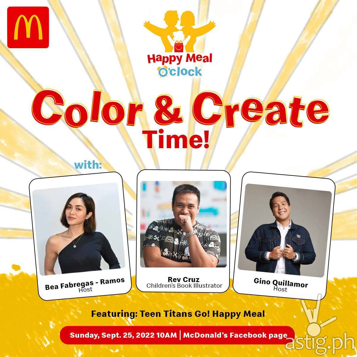 Gain insights on how to unleash the creativity that lies within your child and join the Happy Meal O’ Clock Livestream happening on September 25, 2022 (Sunday), at 10 AM, via the McDonald’s Facebook page. This will be hosted by Bea Fabregas-Ramos and Gino Quillamor. The event will also feature Rev Cruz, a Children’s Storybook Illustrator and a Graphic Designer, who will demonstrate a live coloring demo of the Teen Titans Go posters while also sharing tips on how to nurture kid’s creativity.Through this program, kids will get a sense of achievement as they complete their artworks and at the same time, art sessions at home will also be a unique bonding activity for the family!