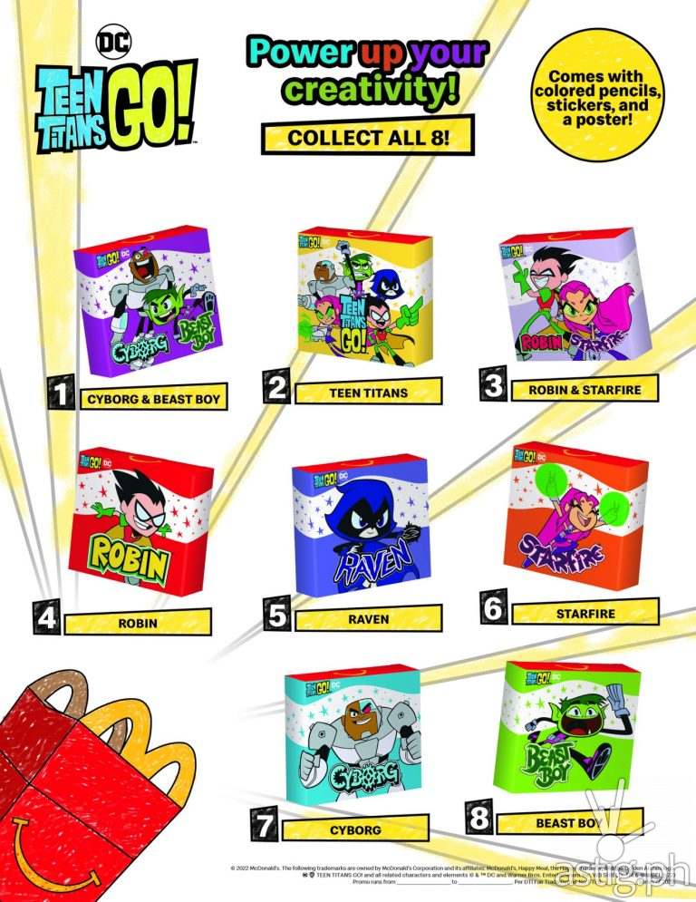 With the 8 NEW Happy Meal coloring kits, you and your little ones can design and create the world of your favorite Teen Titans characters. Unleash your creative streak and experiment with the colors, designs, and patterns of the Teen Titans posters and stickers while having valuable family time together. Through this, your kids will surely enjoy coloring and art as much as they have fun playing with toys.