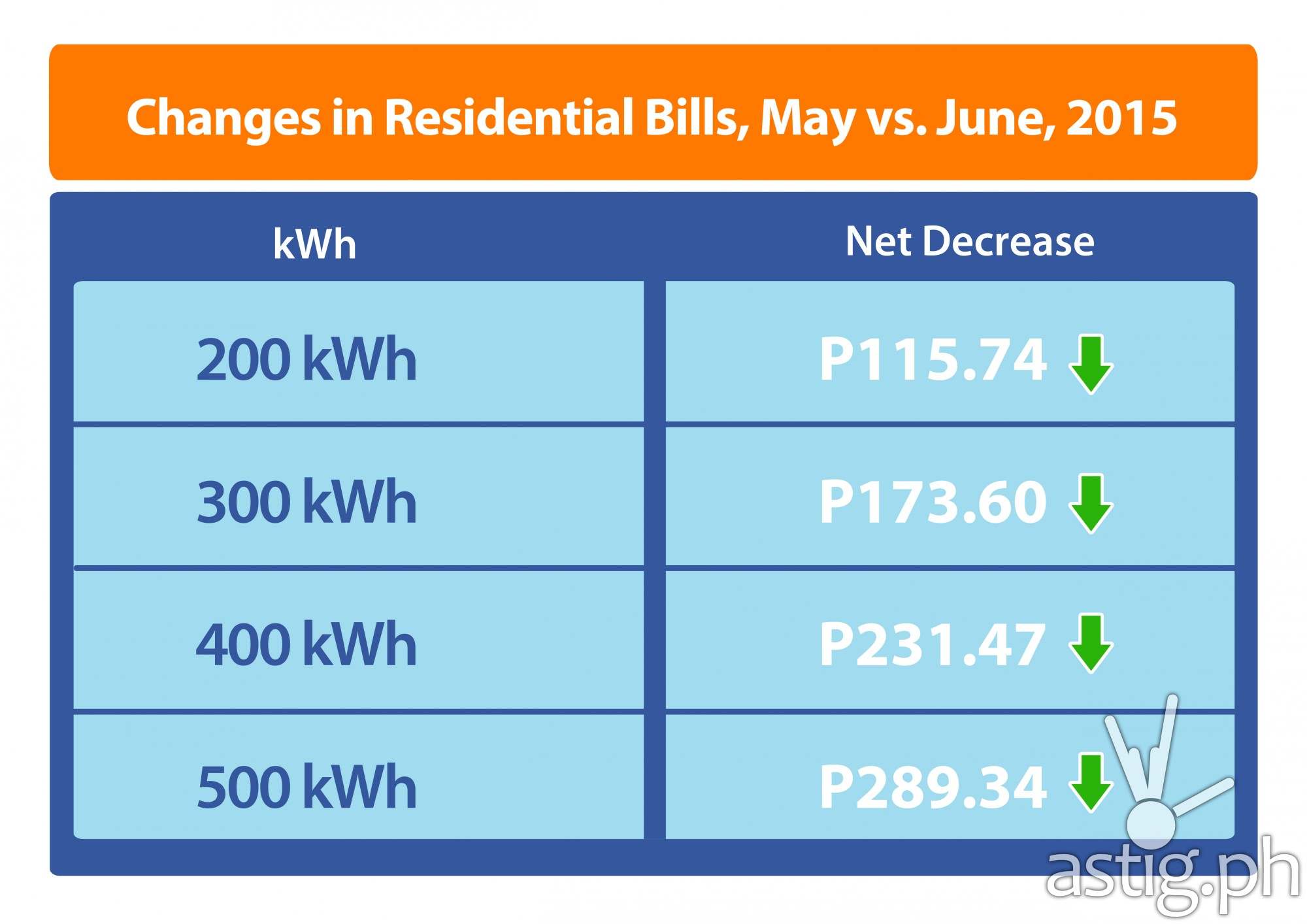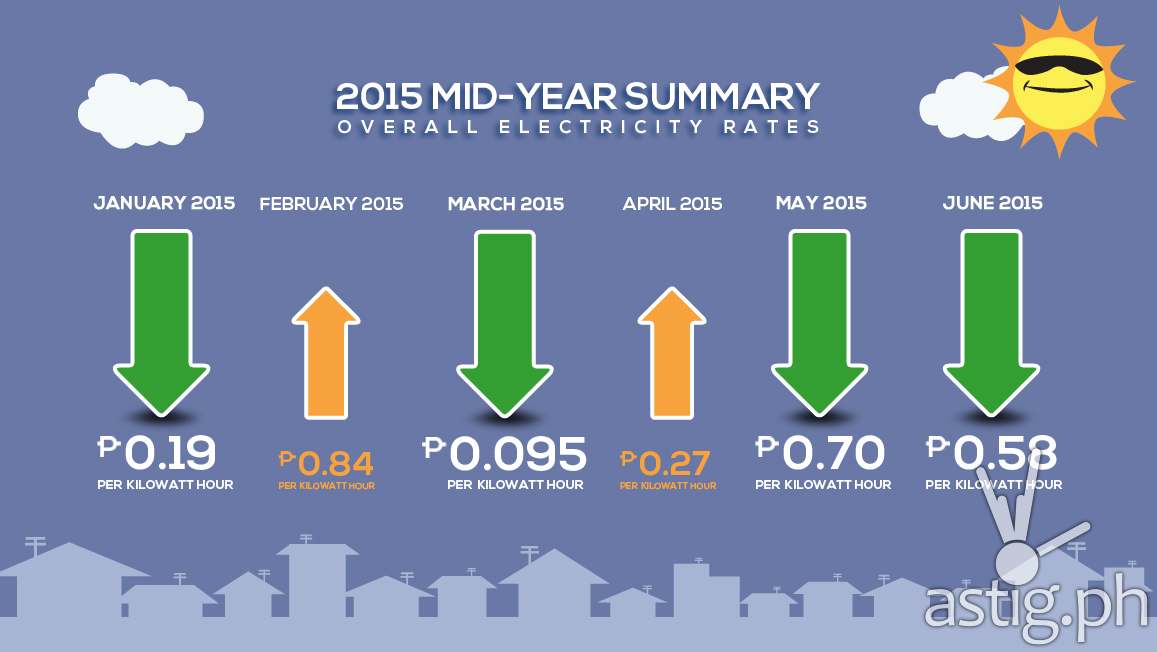For a typical household consuming 200 kWh, the overall electricity bill will go down by PhP 116 compared to last month. At PhP 9.40 per kWh, this month’s overall rate is lower by PhP 1.21 compared to June 2014’s PhP 10.61 per kWh.