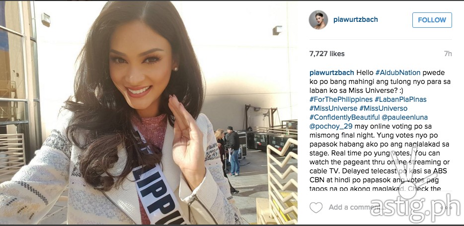 “Hello #AldubNation pwede ko po bang mahingi ang tulong nyo para sa laban ko sa Miss Universe? 🙂 #ForThePhilippines #LabanPiaPinas #MissUniverse #MissUniverso #ConfidentlyBeautiful @pauleenluna @pochoy_29 may online voting po sa mismong final night. Yung votes nyo po papasok habang ako po ang naglalakad sa stage. Real time po yung votes. You can watch the pageant thru online streaming or cable TV. Delayed telecast po kasi sa ABS CBN at hindi po papasok ang votes pag tapos na po akong maglakad. Check the link on my bio for details of voting,” she said.Â