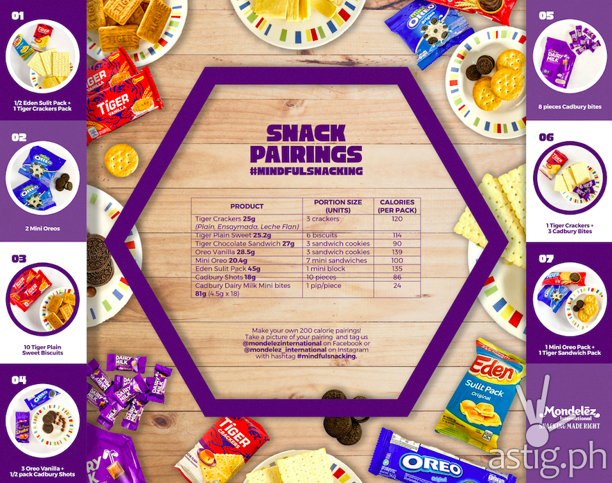 In the Philippines, Mondelez Philippines portion control products include Tiger Crackers and Biscuits, Oreo 3-piece packs and Mini Oreo pouch, Eden Sulit pack, Cadbury Shots, Cadbury Dairy Milk Mini Bites, Cadbury Dairy Milk 15g, Cadbury Lickables and Cadbury 5Star 15g. These are all 200 calories or less per pack and offer the right amounts of calories for a snack. For playful snack pairings you can also enjoy these 200 calorie combinations: Enjoy two packs of Mini Oreos; ½ Eden Sulit Pack with Tiger Crackers; or two packs of Tiger Chocolate Cream Crackers. Chain also offers a few more tips on how to portion your food properly: