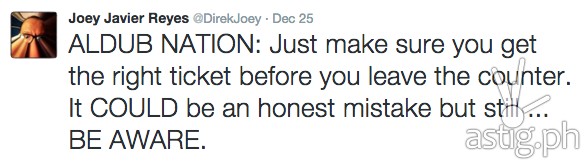 “ALDUB NATION: Just make sure you get the right ticket before you leave the counter. It COULD be an honest mistake but still … BE AWARE.”