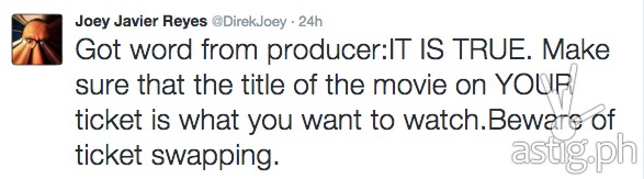 “Got word from producer:IT IS TRUE. Make sure that the title of the movie on YOUR ticket is what you want to watch.Beware of ticket swapping.”