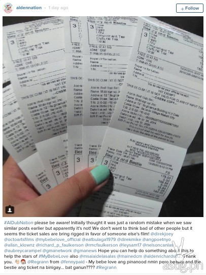 “#AlDubNation please be aware! Initially thought it was just a random mistake when we saw similar posts earlier but apparently it’s not! We don’t want to think bad of other people but it seems the ticket sales are bring rigged in favor of someone else’s film! @direkjoey@octoartsfilms @mybebelove_official @eatbulaga1979 @direkmike @angpoetnyo@allan_klownz @richard_p_faulkerson @rmcfaulkerson @leysam17 @nelsoncanlas@aubreycarampel @gmanetwork @gmanews Hope you can help do something about this to help the stars of #MyBebeLove also @msaiaidelasalas @mainedcm @aldenrichards02. Thank you. @Regrann from @fennypaid – My bebe love ang pinanood nmin pero beauty and the bestie ang ticket na binigay… bat ganun????”