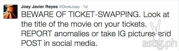 “BEWARE OF TICKET-SWAPPING. Look at the title of the movie on your tickets. REPORT anomalies or take IG pictures and POST in social media.”