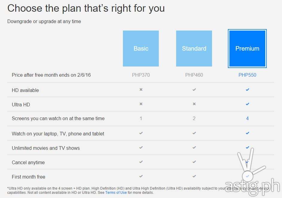 - Premium (660 PHP / month) – stream up to 4 screens at a time in Ultra High Definition