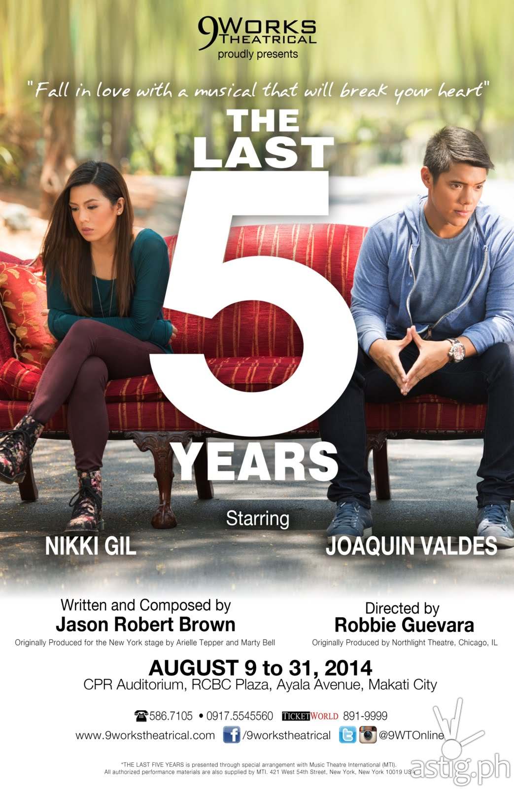 On its fifth year, Philstage Gawad Buhay award‑winning theater company, 9 Works Theatrical, invites you to look back, and move forward, with one of the greatest and most poignant musicals of all time, Jason Robert Brown’s “The Last Five Years.”