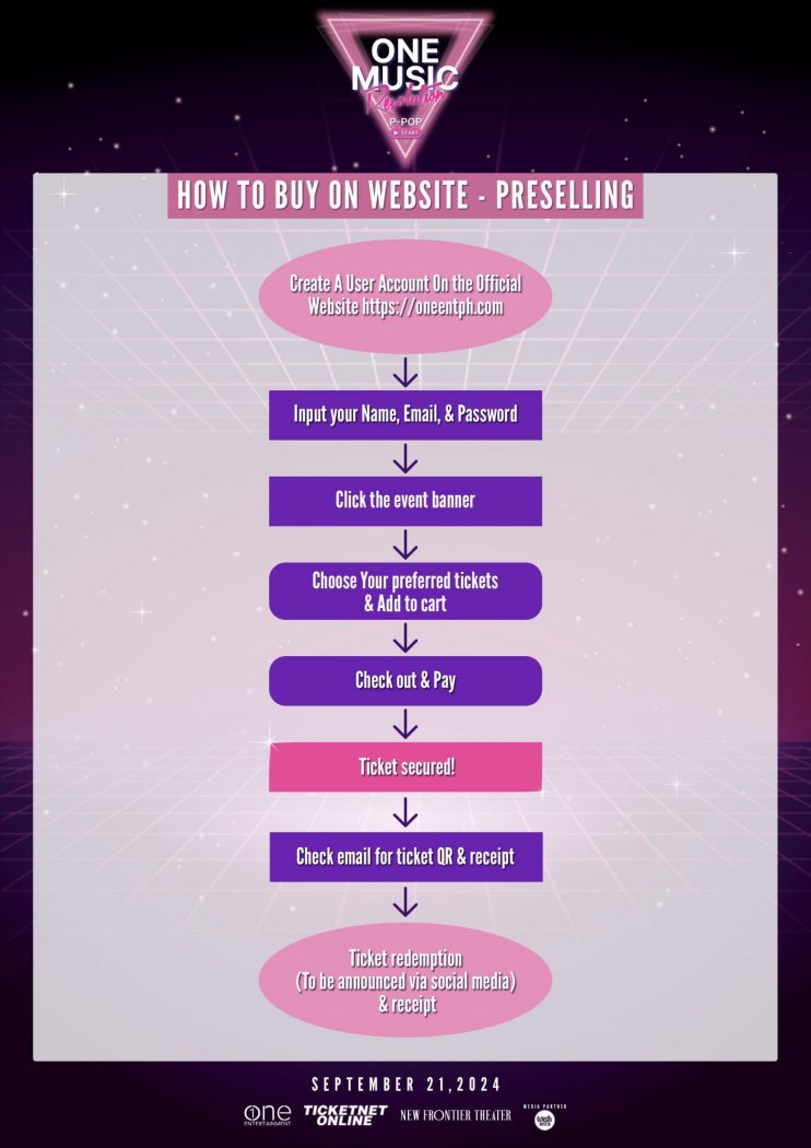 Presented to you by One Entertainment, in partnership with KDR Music House, the pre-selling of tickets (limited per tier) will be held from August 21 to 23, 2024 on www.oneentph.com. The general sale of tickets for the concert will be available from August 24, 2024, onwards at Ticketnet Outlets and online at www.ticketnet.com.ph. All the ticket tiers have fan benefits and vary from reserved seated to standing pens with the following prices: