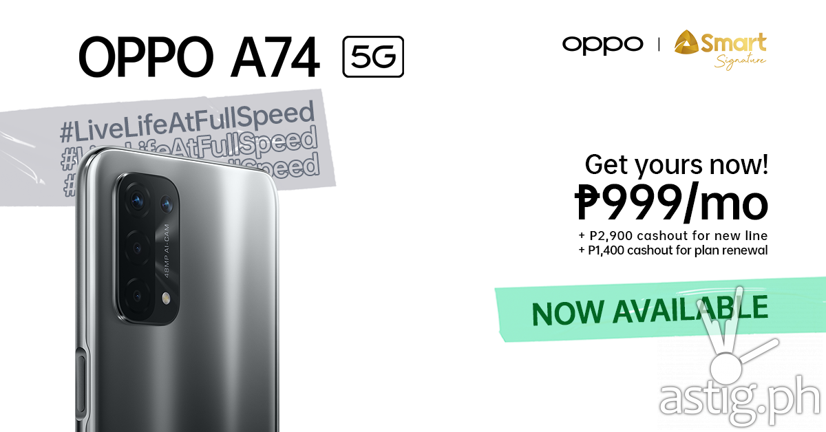 The latest OPPO A74 5G device is now officially available with Smart Signature Plan 999 with at an introductory price that requires only a minimal one-time cash-out of PHP2,900 for new subscribers, and PHP1,400 for recontracting Smart Postpaid customers. The plan comes with 5GB of data, unlimited calls and texts to all networks, and 50 minutes calls to PLDT, and the exclusive offer is available at Smart Stores nationwide and on the Smart Online Store until June 15, 2021 only.