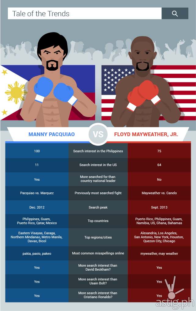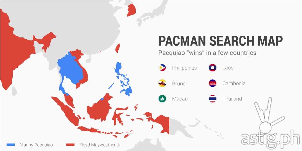 For search giant Google, however, it is fun to think of a pre-fight winner just by looking at the search volume of both fighters. Using Google Trends, Google Philippines prepared an infographic that shows Manny Pacquiao dominating in his home country the Philippines and neighboring countries such as Laos, Brunei, Cambodia, Thailand, and Macau.