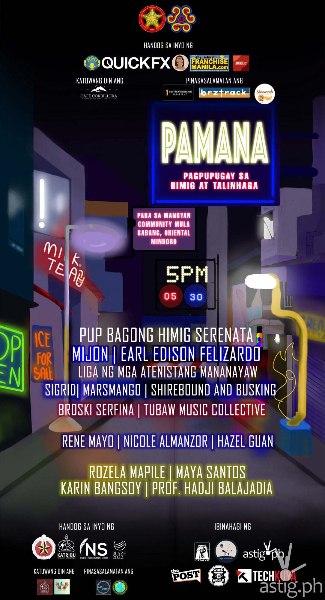 Inihahandog ng PUP Bukluran sa Sikolohiyang Pilipino ang benefit concert na pinamagatang, “PAMANA: Pagpupugay sa Himig at Talinhaga” ngayong ika-30 ng Mayo,ganap na alas singko ng hapon (5 n.h.), via Facebook Live Premiere. Ang mga makakalap na donasyon mula sa aktibidad ay ilalaan sa Mangyan Community mula sa Sabang, Oriental Mindoro.