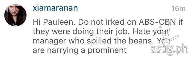One day after, Pauleen once again broke her silence on Instagram, when one of her followers @xiamaranan commented, “Hi Pauleen, Do not irked on ABS-CBN if they were doing their job. Hate your manager who spilled the beans. You are narrying a prominent.”