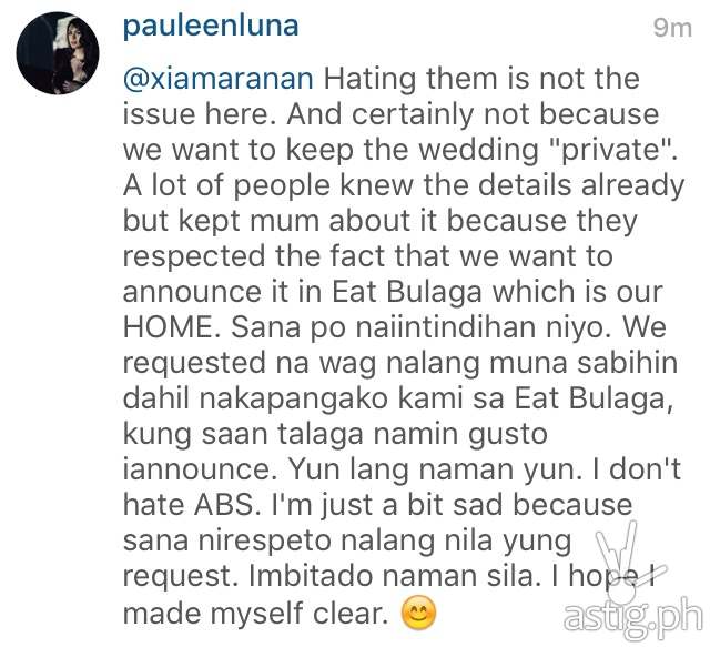 Pauleen explained her position and said, “@xiamaranan Hating them is not the issue here. And certainly not because we want to keep the wedding private. A lot of people knew the details already but kept mum about it because they respected the fact that we want to announce it in Eat Bulaga which is our HOME. Sana po naiintindihan niyo. We requested na wag nalang muna sabihin dahil nakapangako kami sa Eat Bulaga, kung saan talaga namin gusto i-announce. Yun lang naman yun. I don’t hate ABS. I’m just a bit sad because sana nirespeto nalang nila yung request. Imbitado naman sila. I hope I made myself clear.”