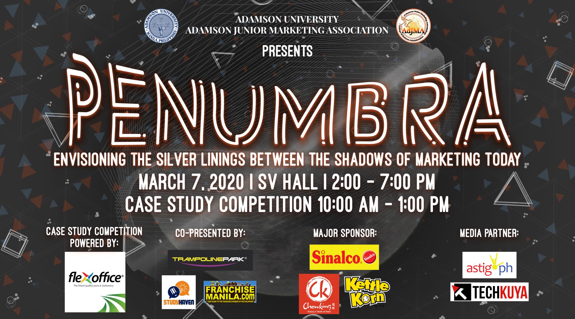 Adamson Junior Marketing Asociation is an official partner organization of Philippine Junior Marketing Association (PJMA) will be holding their flagship event entitled “PENUMBRA: Envisioning the Silver linings between the Shadows of Marketing Today” on March 7, details below.