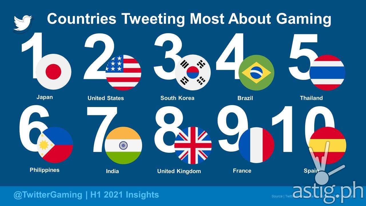 From the 9th place in 2020, PH now ranks up to 6th surpassing India, France, and the United Kingdom. Here’s a look at the countries that have Tweeted about gaming most often in 2021 so far.