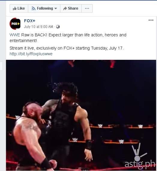 Raw will be air live every Tueday the same time as US FOX+ will stream on demand WWE weekly highlights shows. FOX+ is available on android and iOS app so you can stream it anytime anywhere. Visit foxplus.com, facebook.com/FOXPlusPH and wwe.com for more info. Fox networks group has a reach of 1.725 billion households in more than 30 channels and WWE reach 800 million homes worldwide translated into 24 languages.
