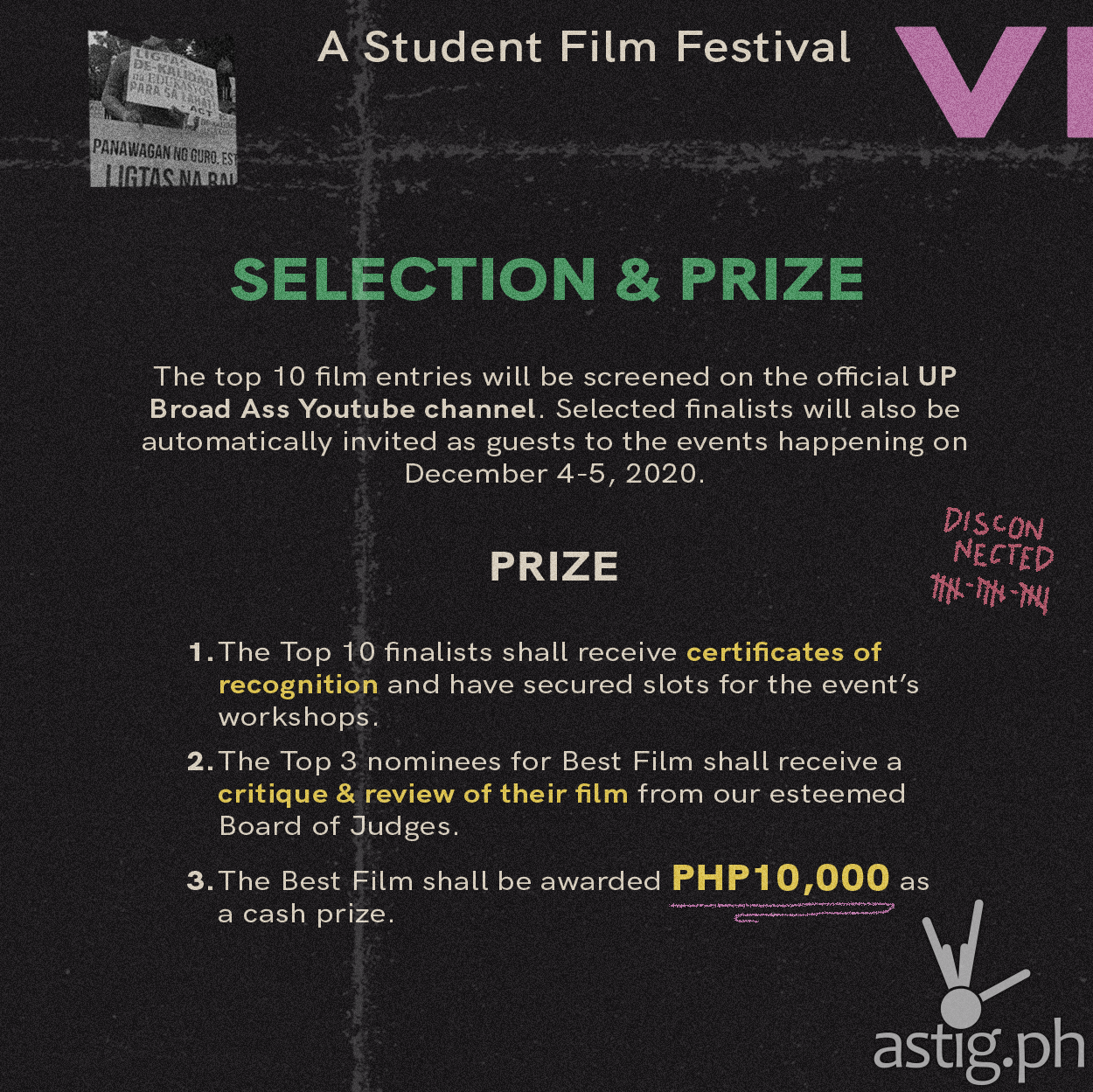 9. The Top 10 finalists shall receive certificates of recognition and have secured slots for the event’s workshops and the Best Film shall be awarded PHP10,000 as a cash prize.