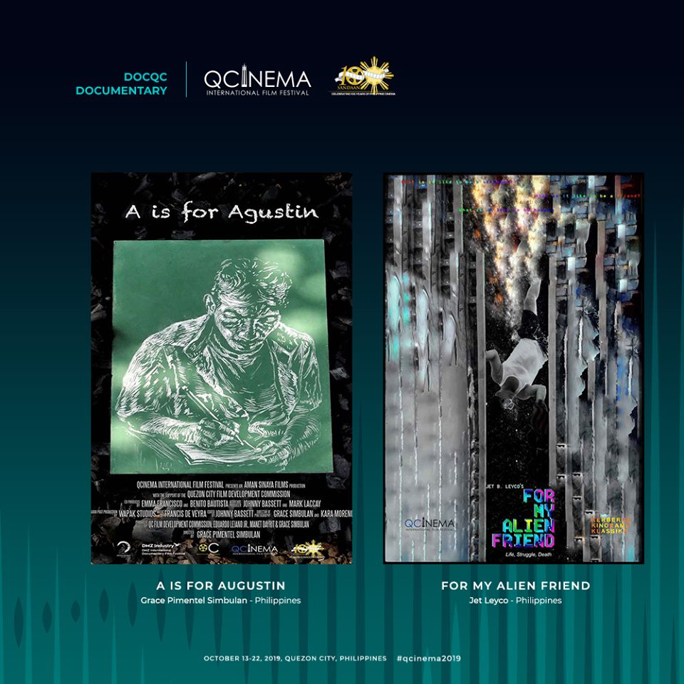 Three new Filipino documentary features, recipients of post-production grants of P500,000 each, will premiere in the section, DocQC. They are For My Alien Friend (by Jet Leyco), A is for Agustin (Grace Pimentel Simbulan) and Spring by the Sea (Aleia Garcia).