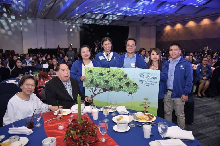 After the alumni’s musical number five representatives from various batches presented the alumni’s gift to Mr. and Mrs. Henry Sy Sr. – a wall art depicting “Scholars for Scholars” a project of “Tatang’s graduates” (SM scholar-alumni) to pay tribute to the founder of SM Foundation and to pledge to “pay forward” the generosity of the Sys to other less-fortunate but bright students (who were once like them). The five gift presentors, Emylou Cadalzo, Loida De Vera, Elly Bala, Novelyn Beboso, Jeffry Manhulad turned over to Debbie Sy, executive director of SM Foundation, the “seed fund” of over P100,000 that they raised amongst themselves to sponsor one college scholar for schoolyear 2019-2020 and pledged to increase the number in the future. They also distributed voluntary pledge forms during the program.