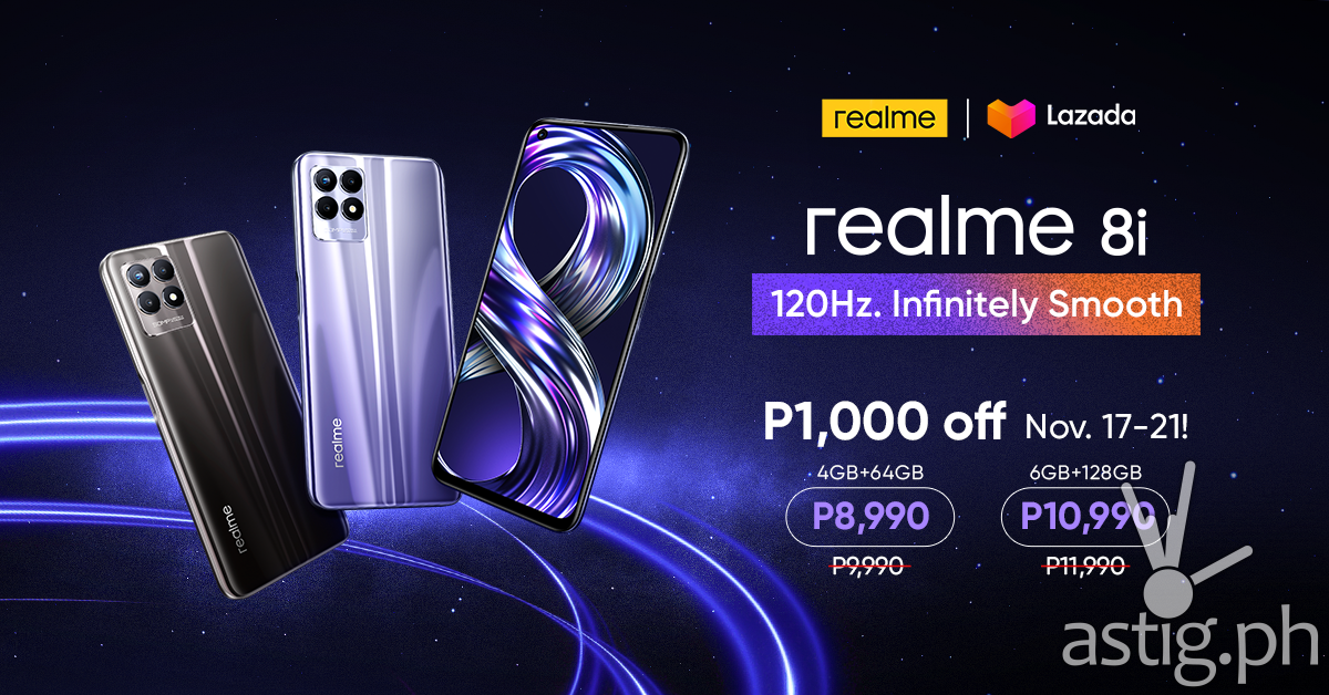 Enjoy an #InfinitelySmooth experience today by getting the realme 8i for only P9,990 (4GB+64GB) and P11,990 (6GB+128GB) on the realme Official Store on Lazada. Early-birds can get an exclusive P1,000 discount for both variants on Lazada starting 12 a.m. on November 17. Available in two colors: Stellar Purple and Space Black, the realme 8i will also be available in over 500 offline stores and more than 4,000 partner dealers nationwide.
