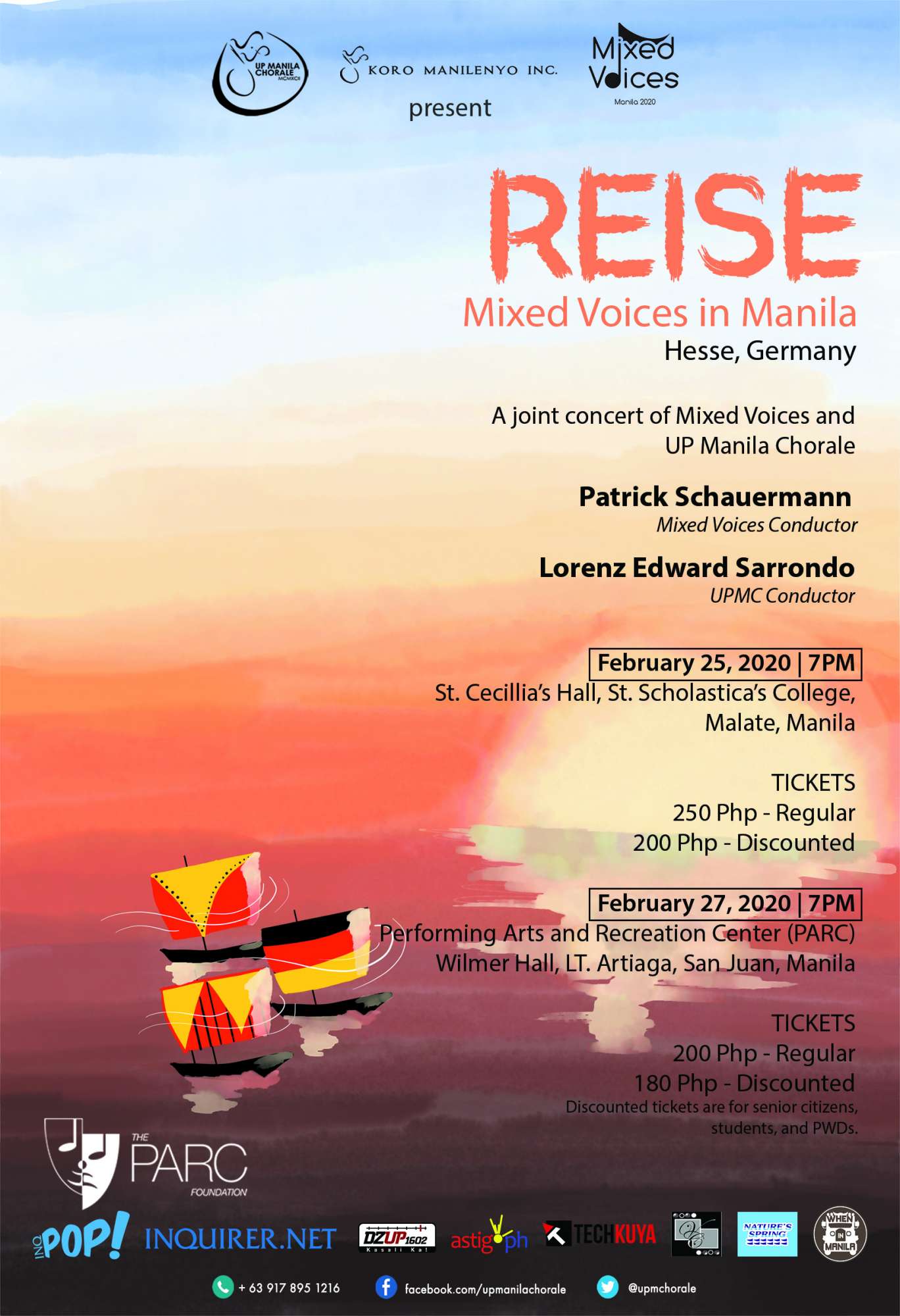 The UP Manila Chorale will be hosting the Mixed Voices in their first Philippine tour entitled Reise: Mixed Voices in Manila. Mixed Voices is a group of Hessian choirs led by music director Mr. Patrick Schauermann. A total of 32 singers will be traveling to sing in Manila, to experience Philippine culture, and to share the culture of Germany.