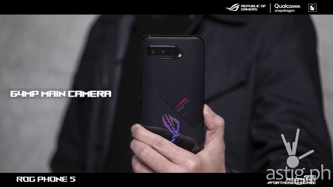 For photos and videos, the ROG Phone 5 features a triple-camera system in its rear consisting of a 64MP f/1.8 wide angle lens, a 13MP f/2.4 ultra-wide lens, and a 5MP f/2.0 macro lens. For selfies, the phone is endowed with a 24MP f/2.5 camera.