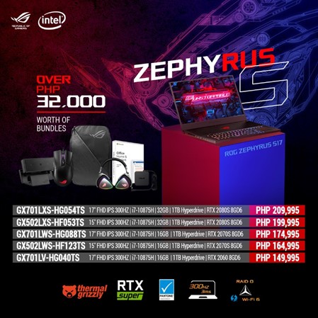 | ROG Zephyrus S17 | GX701LWS-HG088TS | 17″ FHD IPS 300HZ / i7-10875H / 16GB RAM 1TB PCIE Hyperdrive / RTX 2070S 8GD6 | 174,995 | ROG Delta Headset, ROG Gladius 2 Mouse, ROG Eye C21 Webcam, ROG Backpack, ASUS 65W PD Adapter, Office Home & Student 2019 |