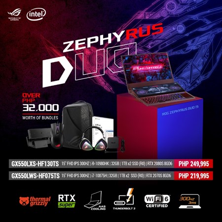 | ROG Zephyrus Duo 15 | GX550LXS-HF130TS | 15″ FHD IPS 300HZ / i9-10980HK / 32GB RAM 1TB x2 PCIE SSD (Raid 0) / RTX 2080S 8GD6 | 249,995 | ROG Delta Headset, ROG Gladius 2 Mouse, ROG Eye C21 Webcam, ROG Ranger BP2500 Backpack, ASUS 65W PD Adapter, Office Home & Student 2019 |