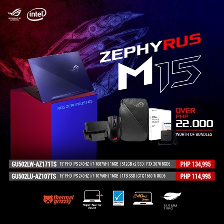 | ROG Zephyrus M15 | GU502LW-AZ171TS | 15″ FHD IPS 240HZ / i7-10875H / 16GB RAM 512GB x2 PCIE SSD / RTX 2070 8GD6 | 134,995 | ROG Gladius 2 Mouse, ROG Backpack, ROG Eye C21 Webcam, ASUS 65W PD Adapter, Office Home & Student 2019 |