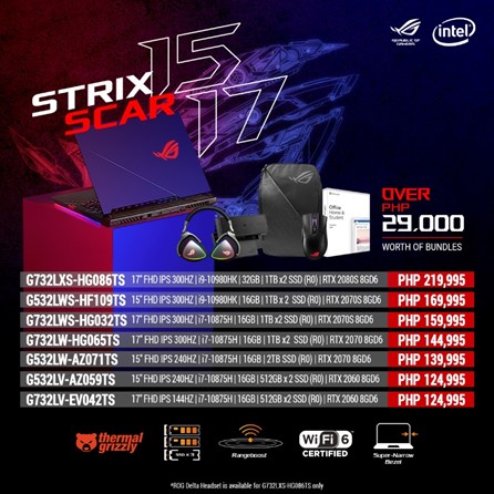 | ROG Strix Scar 15 | G532LW-AZ071TS | 15″ FHD IPS 240HZ / i7-10875H / 16GB RAM 2TB PCIE SSD (Raid 0) / RTX 2070 8GD6 | 139,995 | ROG Gladius 2 Mouse, ROG Eye C21 Webcam, ROG Backpack, Office Home & Student 2019 |