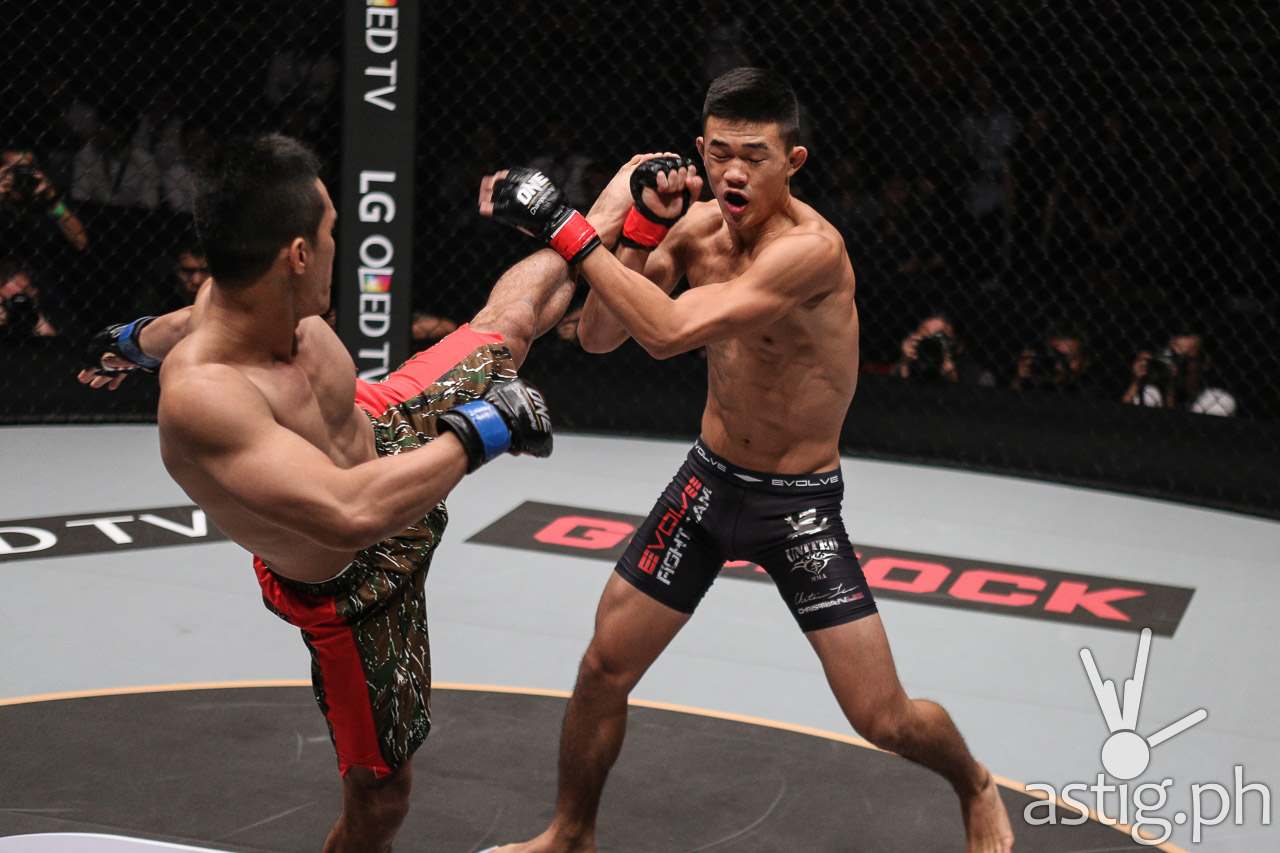 Singapore’s Christian “The Warrior” Lee continues his meteoric rise through the ranks with his fourth straight stoppage victory, turning in a sensational performance against the Philippines’ Cary “The Prince” Bullos to win by submission. Lee started off with his familiar unorthodox stance, peppering Bullos with sidekicks. When Bullos tried to close the gap, Lee took advantage by latching onto the Filipino’s neck. Within moments, Lee was able to drag Bullos to the ground, sinking in the D’Arce Choke to force the tap.