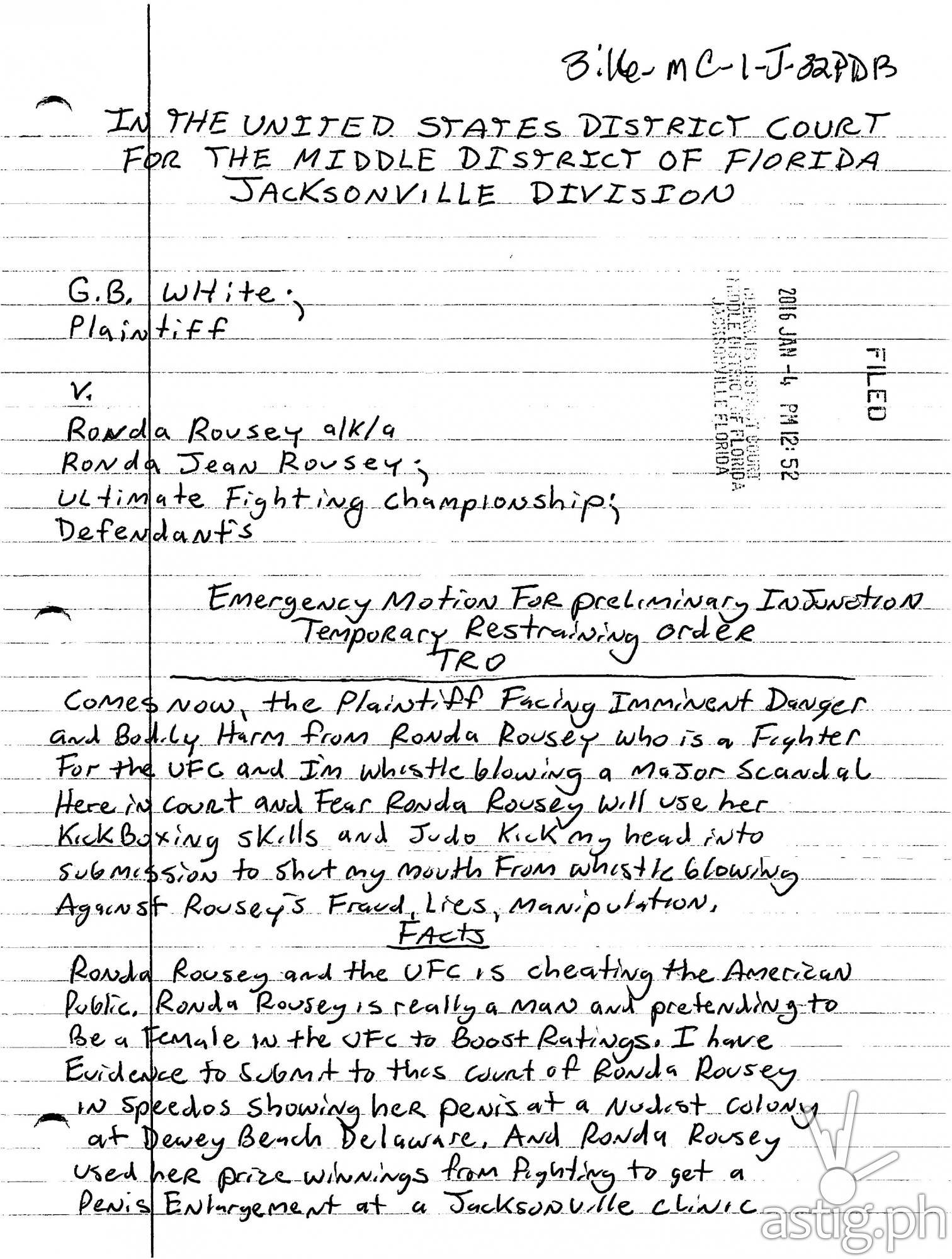 A hand-written temporary restraining order filed in Jacksonville, Florida by G.B. White alleges that Ronda Rousey is really a man and that she is pretending to be female to boost UFC ratings.